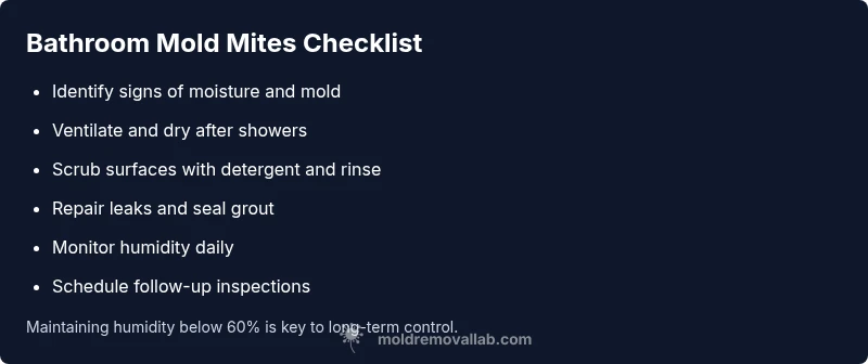 Mold mites in bathroom are tiny arthropods that feed on mold and organic debris found in damp areas. They thrive in spaces with standing humidity, such as shower stalls, behind tiles, and under sinks. The Mold Removal Lab team notes that these pests are indicators of excess moisture more than dangerous biting insects; the real risk is the mold itself and the allergic reactions it can trigger. To homeowners, the key takeaway is that moisture control is your first defense. This means fixing leaks, improving ventilation, and drying surfaces promptly after use. Understanding their lifecycle helps you interrupt their population growth and reduce recurring sightings. By addressing both the pests and the moisture sources, you create a safer bathroom environment for your family.