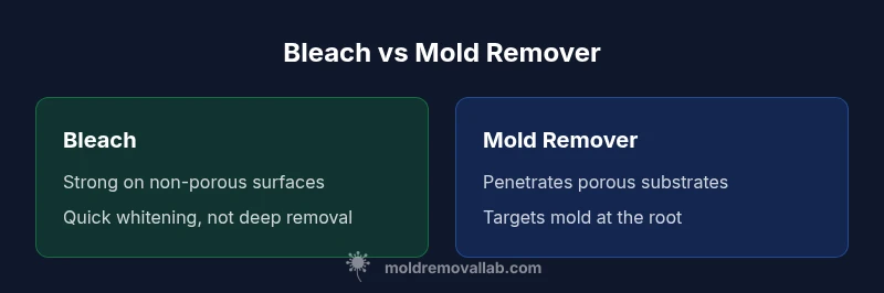 Many homeowners ask whether is mold remover better than bleach for routine, indoor mold issues. The short answer depends on the surface, the extent of growth, and the goal (kill the mold vs clean the surface). In this article, the Mold Removal Lab team outlines a practical framework to compare these options, with a focus on safety, efficacy, and long-term results. We start with the basic distinction: bleach is a chlorine-based sanitizer that can whiten stains but often does not remove mold roots embedded in porous materials. Mold remover products, by contrast, are designed to penetrate surfaces and leave residues that inhibit immediate regrowth. According to Mold Removal Lab, choosing the right product reduces the risk of repeated outbreaks and protects indoor air quality. Throughout, we’ll refer to real-world scenarios you might encounter in kitchens, bathrooms, basements, and laundry areas.