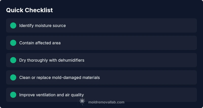 - Locate and fix the moisture source: repair leaks, seal gaps, and improve waterproofing so the odor source cannot recur. 2) Contain the space to prevent mold spores from spreading: close doors, use plastic sheeting, and avoid disturbing moldy materials. 3) Dry thoroughly: use high-capacity dehumidifiers and fans, keep humidity below 50-60% if possible, and ensure airflow reaches wall cavities and subfloor areas. 4) Clean and treat surfaces: wipe non-porous surfaces with an appropriate cleaner; avoid dry brushing mold into air; for porous materials, consider removal if mold growth is extensive. 5) Manage HVAC and filtration: replace filters, run exhaust fans, and ensure air exchanges are helping to remove odor rather than recirculating it. 6) Inspect for odor persistence after drying: if smell remains, don’t over-wet the area; reassess moisture, re-dry, and re-verify. 7) Document and monitor: take photos, log humidity, and schedule follow-up checks. Pro tip: If you are unsure about safety or scope, contact a professional remediation service.