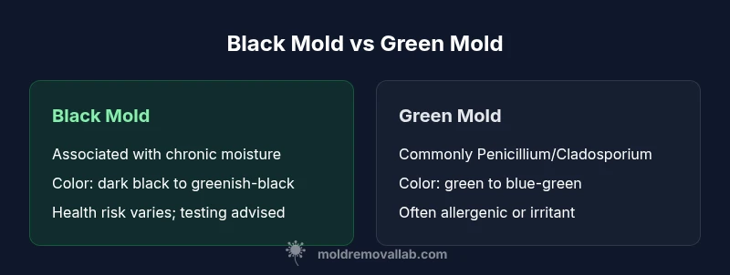 Color is a visible clue, not a definitive diagnosis. In practice, the terms black mold and green mold describe broad color categories that encompass multiple species. According to Mold Removal Lab, relying on color alone can lead homeowners to underestimate or overstate risk. The phrase black mold vs green mold should prompt a cautious approach: verify with proper sampling, assess moisture sources, and implement containment where necessary. The most reliable path is lab testing to confirm species, evaluate toxin production, and guide remediation decisions. In many homes, molds appear in shades from dark charcoal to olive-green, depending on environmental conditions, surface material, and age of the colony. This block lays the groundwork for understanding why color cannot be the sole determinant of risk and why moisture context matters more than hue alone.