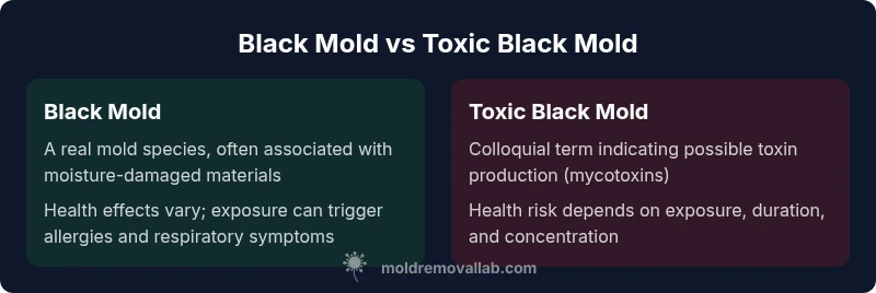 Many homeowners use the terms black mold and toxic black mold interchangeably, but there are important distinctions. Black mold typically refers to dark-colored molds, most often species in the Stachybotrys group, which are known for producing mycotoxins under certain conditions. The phrase toxic black mold is a lay term used by the public to signal potential toxin exposure. According to Mold Removal Lab, the exact identity and toxin production depend on environmental factors, moisture, substrate, and microbial competition. In practice, treat any dark mold as a potential health concern and begin moisture control and safe cleanup promptly. This guidance helps homeowners interpret damp spaces, plan a remediation approach, and communicate with professionals.