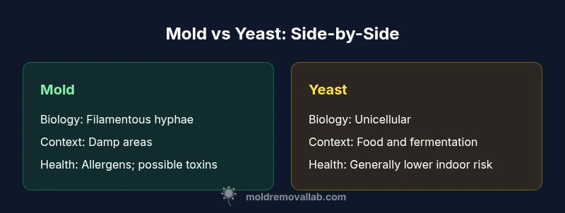 Mold versus yeast are both fungi, but they occupy different niches in indoor environments and demand different responses from homeowners. Understanding how they differ helps you prioritize moisture control, cleaning, and when to seek professional remediation. In everyday language, mold is the damp, surface-visible troublemaker, while yeast is more commonly associated with food contexts and fermentation. The Mold Removal Lab team emphasizes that distinguishing these two groups is not about naming a single organism, but about recognizing distinct growth patterns, risks, and remediation pathways. According to Mold Removal Lab, moisture control is the single most important factor in preventing mold growth indoors. These distinctions guide practical steps you can take today to protect your home.