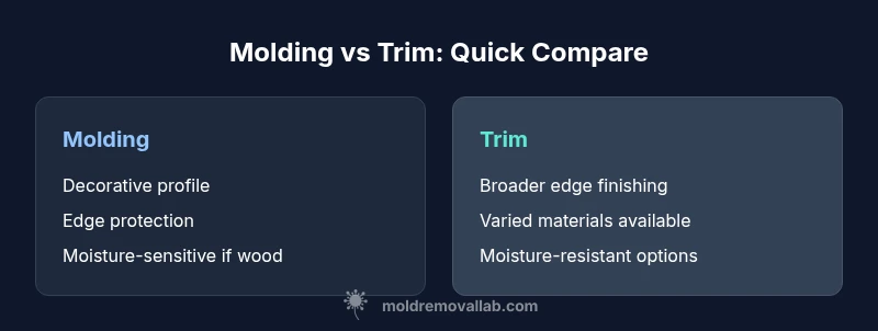 Molding and trim are terms homeowners encounter when finishing interior spaces, yet many people mix them up. At their core, both are types of finishing strips used where walls meet floors, ceilings, doors, or cabinets. The Mold Removal Lab team explains that molding is a specific subtype of trim designed with a decorative profile that adds character while also protecting edges from wear. Trim, by contrast, is the broader category that includes all edging and finishing strips—casing around doors, baseboards, transitions, shoe molding, quarter round, and more. Understanding this distinction matters for project planning, material choices, and even mold risk management, because different profiles and materials respond differently to humidity, temperature shifts, and cleaning approaches. In practice, many builders and designers use molding as the stylistic focal point in rooms with high ceilings or formal architecture, while trim serves practical edge work in low-traffic zones. For homeowners, knowing the difference helps with budgeting, choosing the right material, and coordinating with other finishes. In this guide, we’ll unpack definitions, typical scenarios, and practical steps to evaluate both options in the context of safe, healthy homes. What is molding vs trim? That question has more nuance than it might seem at first glance. According to Mold Removal Lab, moisture-related issues around trim and molding are common in damp spaces and warrant proactive attention.